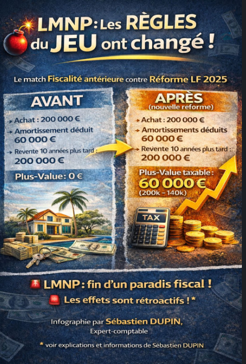 Pendant des années, le LMNP a été présenté comme👉 le régime préféré des investisseurs,👉 la solution “sans impôt” (ou peu),👉 le graal de l’immobilier locatif. 📉 La réforme LF 2025 change tout. 📊 Cas réel :• Achat : 200 000 €• Amortissements déduits : 60 000 €• Revente 10 ans plus tard : 200 000…